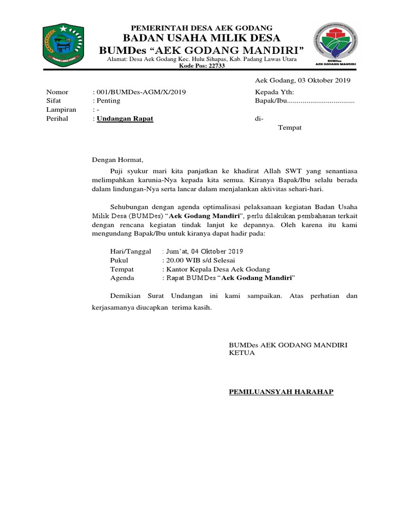 Contoh Surat Undangan Rapat Bumdes Doc / Contoh Surat Undangan Rapat Bumdes Doc - Sample Surat Undangan - Contoh surat undangan rapat perusahaan.. Savesave surat undangan rapat bumdes for later. Contoh surat undangan rapat sekolah. Surat undangan adalah surat yang dibuat dengan tujuan mengajak seseorang atau pihak lain untuk menghadiri sebuah acara tertentu. Mungkin kebanyakan dari kita telah mengenal dengan jenis surat yang satu ini. Surat undangan rapat adalah surat yang dibuat untuk kepentingan membeitahukan kepada seseorang maupun kelompok agar dapat menghadiri sebuah rapat tentang sesuatu pada waktu serta tempat yang telah ditentukan sebelumnya.